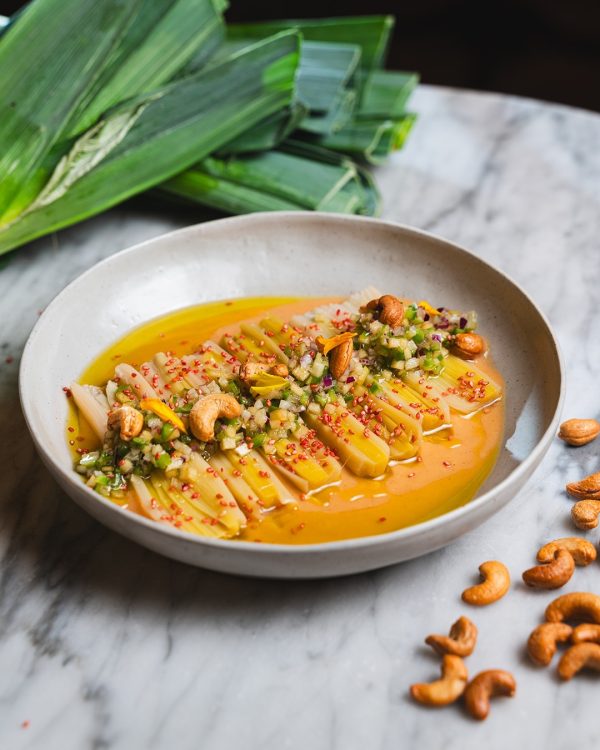• Puerros al vapor, crema de harissa, vinagreta de manzana verde